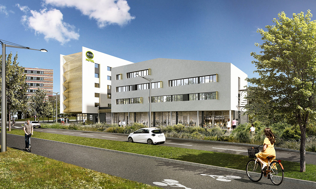 Au carrefour du boulevard et de la rue Émile-Rousse, dans la zone de l’Arena, Mur-murs construit un ensemble comprenant un hôtel de 85 chambres B&B, associé à 300 m² de commerces et à 750 m² de bureaux. Le Grand Mât confirme le renouveau de cette partie de la rive droite et répond à un besoin sur cette zone en offrant une formidable localisation à proximité de l’Arena, de la zone d’activité de Thales, facilement accessible via le tramway…